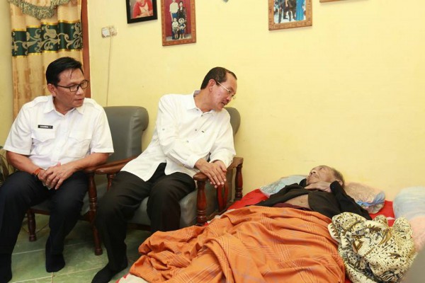 Akhirnya Walikota Palembang H Harnojoyo didampingi Kepala Dinas Kebudayaan Palembang H Sudirman Tegoeh mengunjungi rumah Mang Ujang , Rabu (11/10).