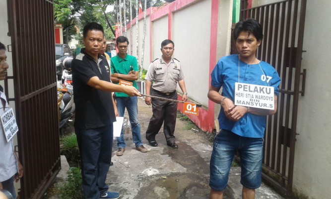 Dalam rekonstruksi yang memperagakan 10 adegan oleh Polsek Ilir Barat I, Kamis (12/9), terlihat Heri menikam Imin secara membabi buta setelah korban mengeluarkan pistol.