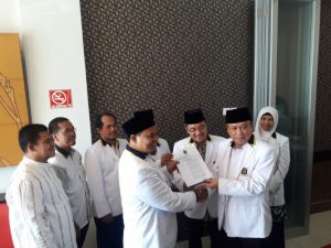 Suasana Ketua DPD Partai PKS Kota Palembang Ridwan Saiman SH MH , Selasa (24/10) saat menunjukkan surat keputusan DPP PKS kepada Ir H Sarimuda MT dan Ir Kgs H Abdul Rozak M Sc, Selalsa (24/10).