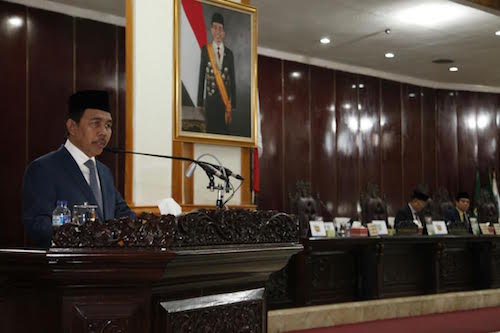 Palembang, BP–Wakil Gubernur Sumatera Selatan H Ishak Mekki memberikan jawaban terhadap pemandangan umum fraksi-fraksi DPRD Sumsel atas penjelasan Gubernur Sumsel atas rancangan peraturan daerah tentang pertanggungjawaban pelaksanaan APBD Sumsel tahun anggaran 2017 di ruang rapat paripurna DPRD Sumsel, Selasa (17/7).