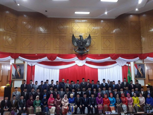 Gubernur Sumsel H Alex Noerdin berpoto bersama dengan pimpinan dan seluruh anggota DPRD Sumsel di ruang rapat paripurna DPRD Sumsel, Senin (17/9).