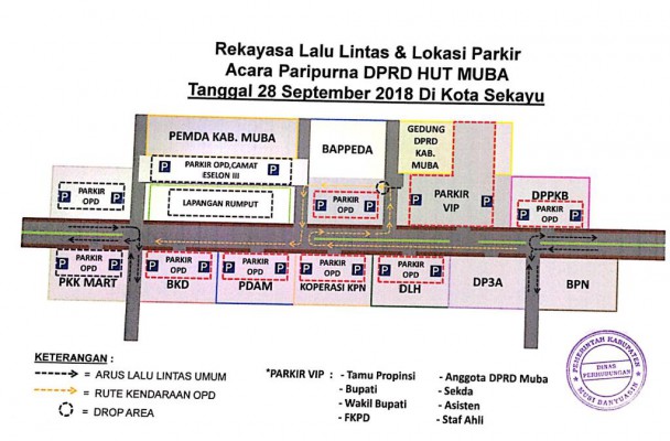 Demi kenyamanan warga menyaksikan puncak HUT Muba 2018, Pemkab Muba membuat kantong parkir. HUT Kabupaten Musi Banyuasin (Muba) ke 62 tahun tanggal 28 September mendatang, Pemkab Muba melalui Dinas Perhubungan (Dishub) Kabupaten Muba tak mau warga suaah. “Sudah disiapkan kantong parkir bagi tamu undangan yang akan menghadiri Sidang Paripurna DPRD Kabupaten Muba dalam rangka Peringatan HUT Muba ke 62 tahun. Sambutpuncak Peringatan HUT Muba ini, kami telah menyiapkan rekayasa lalu lintas di sekitaran lapangan gedung DPRD Kabupaten Muba. Kantong parkir juga ada di halaman kantor DPPKB, Bappeda, Sekretariat Daerah, BPN, DP3A, PDAM, DLH, Koperasi KPN, dan BKDSDM serta PKK Mart “ujar Kepala Dishub Kabupaten Muba, H Pathi Ridwan SE ATD MM saat diwawancarai.