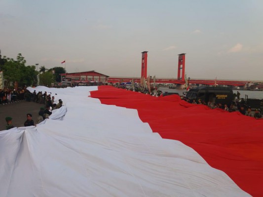aksi pembentangan bendera Merah Putih berukuran raksasa di Pelataran Parkir Benteng Kuto Besak (BKB), Palembang, di pesisir Sungai Musi, Sabtu (29/9) sore.