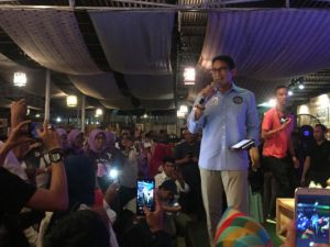 Palembang, BP — Meski memiliki aktifitas yang padat, Calon Wakil Presiden Republik Indonesia Sandiaga Uno meluangkan waktunya untuk berkunjung ke Kota Palembang. Kedatangan Sandiaga pun untuk menghadiri acara Ngopi Bareng Bang Sandi bersama mahasiswa, di Gunz Cafe Palembang, Jumat (7/12) malam.