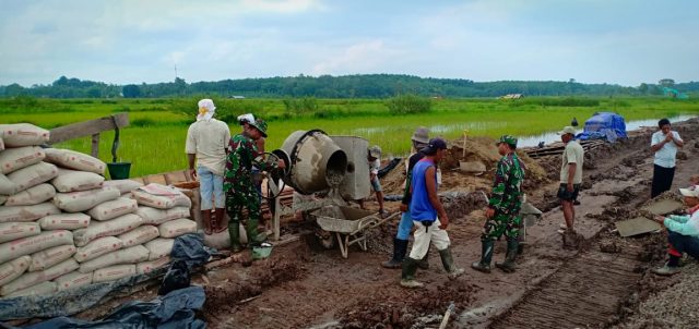 Satgas dibantu masyarakat hari melakukan pengecoran tiang jembatan yang menghubungkan dua kampung dikelurahan Pulokerto