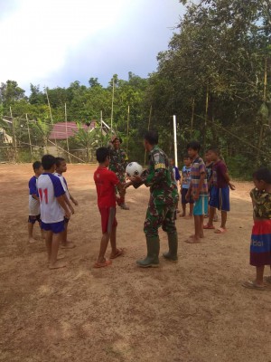 Nampak anak-anak tersebut riang bergembira mendapatkan tehnik bermain bola dari kedua tentara tersebut, yang kemudian dilanjutkan dengan bermain bola bersama-sama.