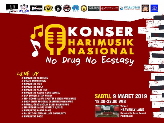 Tahun 2019 ini Palembang untuk pertamakalinya membuat event dalam rangka Hari Musik Nasional dalam format yang spesial. Acara yang bertajuk Konser Hari Musik Nasional – No Drug No Ecstasy ini akan berlangsung tepat pada hari Sabtu 9 Maret 2019 bertempat di Heavenly Land Komplek Ilir Barat Permai Palembang mulai pukul 18.30 sampai 22.00 gratis terbuka untuk umum. Tema No Drug No Ecstasy sengaja di tampilkan dalam rangka ikut mendorong program Pemerintah Kota Palembang dan Badan Narkotika Nasional Provinsi Sumsel agar Kota Palembang dan Sumsel pada umumnya bisa bebas dari narkoba.