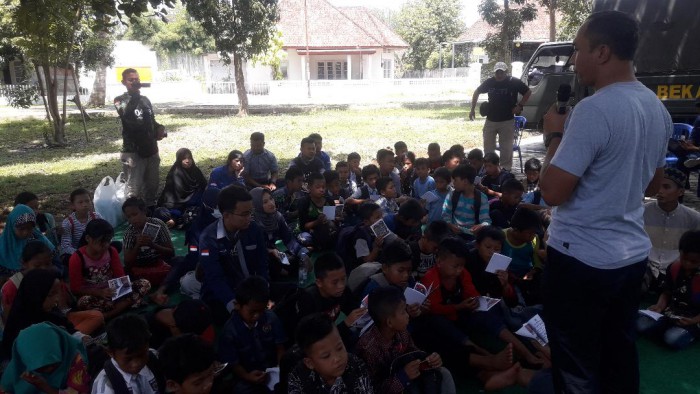 “ Kita walaupun dari daerah pelosok tetap semangat, tetap optimis, kalian bisa menjadi apa saja, ayo, bagi butir-butir Pancasilanya ke anak-anak ini,” kata Honi kepada anak buahnya.#osk