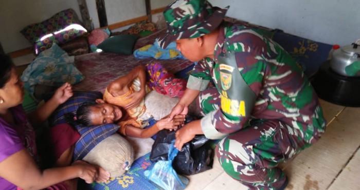 Anggota Satgas Babinsa 01/Makrayu Serda M Amsori bersama Ketua RT 23 Kampung Pulokerto, Damri memberikan bantuan berupa sembako kepada Nenek Onah, Minggu (17/3).