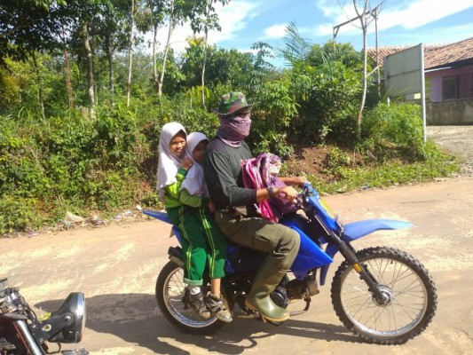 Anggota Satuan Tugas (Satgas) TNI Manunggal Membangun Desa (TMMD) ke 104 Kodim 0418/Palembang Pelda Suparno menjemput anak sekolah dengan motor trail. Hal ini dilakukan karena kondisi jalan yang begitu berat, Sabtu (23/3).