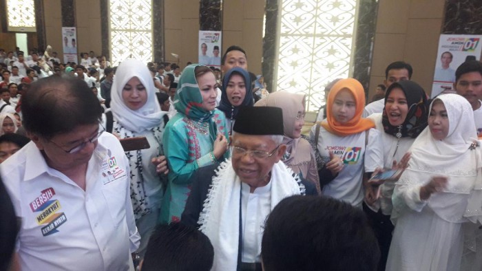 Ma’ruf tiba dilokasi didampingi sang istri, Wury Estu Handayani dan anak keduanya, Siti Mamduhah. Ma’ruf pun disambut ribuan generasi milenial Palembang. Mereka kompak mengenakan kais putih itu tampak dengan riang menyanyikan yel-yel kemenangan pasangan calon nomor urut 01, Jokowi-Ma’ruf.