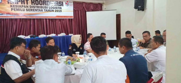 Sekayu, BP–Bupati Kabupaten Musi Banyuasin H Dodi Reza Alex diwakili Kepala Badan Kesatuan Bangsa dan Politik Muba H Soleh Naim mengikuti Rapat Koordinasi Kesiapan Distribusi Logistik Pemilu Tahun 2019 di Aula Hotel Ranggonang Sekayu, Selasa (9/4/2019).