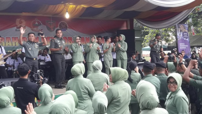 Suasana hiburan usai Persit Kartika Candra Kirana (KCK) PD II Sriwijaya bekerja sama dengan Kementrerian BUMN (KemenBUMN) RI yang berada di wilayah Sumsel menyelenggarakan kegiatan Bakti Sosial (Baksos) Pasar Murah dan Pengobatan Gratis, Rabu (10/4)