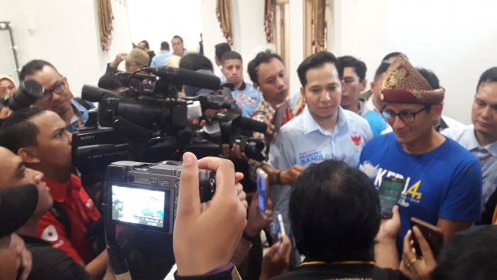 Sandiaga Uno usai menggelar kampanye nasional Milenial di Ballroom Sultan Convention Center, Palembang tepatnya di Jalan Sultan Mansyur Bukit Lama, Palembang, Jumat (12/4).