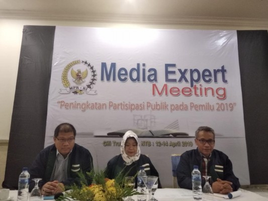 “Majelis Permusyawaratan Rakyat (MPR) mengajak praktisi media massa ikut menggelorakan minat publik datang ke tempat pemungutan suara (TPS) menyalurkan aspirasi politik17 April. Hanya lima menit waktu kita di bilik TPS tapi bisa menentukan nasib bangsa lima tahun ke depan. Ayo….mari kita berbondong-bondong ke TPS memilih presiden dan anggota legislatif,’ ajak Kepala Biro Humas MPR RI Siti Fauziah di Gili, Terawangan, Lombok, Jumat malam (12/4) kepada puluhan wartawan dalam acara Media Expert Meeting.