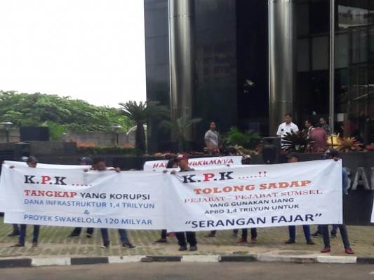 Jakarta, BP—Puluhan warga Sumatera Selatan berunjuk rasa di depan Gedung KPK, Jakarta, Jumat (12/4) siang. Mereka yang menamakan diri Kesatuan Aksi Pemantau Korupsi, Kolusi dan Nepotisme atau KAPAKKN Sumsel itu meminta KPK mengawasi ketat para pejabat pemerintahan mulai gubernur, bupati/walikota, camat, lurah, hingga ketua RT/RW di Sumsel yang memiliki kerabat calon legislatif untuk mencegah terjadinya money politic dalam pileg dan pilpres.