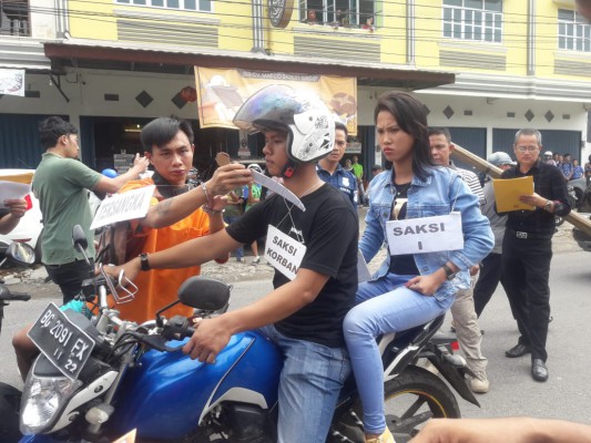 Rekontruksi di lokasi tempat kejadian perkara (TKP) dilakukan pada Kamis (13/6/2019), dengan memperagakan 12 adegan dimulai pada saat posisi tersangka melihat korban membonceng istri tersangka dan tersangka cekcok hingga berujung penikaman.