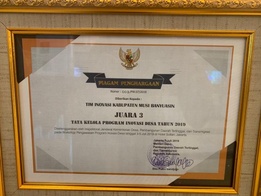 Richard menyebutkan, dalam rangkaian Tata Kelola Program Inovasi Desa Tahun 2019 dari Kemendesa-PDTT diikuti seluruh Kabupaten se-Indonesia, alhasil Muba meraih juara III sedangkan juara II diraih Kabupaten Pesawaran, dan juara I diraih Kabupaten Gunung Kidul.