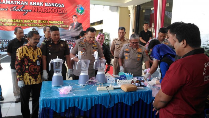 Direktorat Reserse Narkoba Polda Sumsel memusnahkan narkotika jenis sabu seberat 925,084 gram dan ganja seberat 144 kilogram hasil ungkap kasus dibulan Mei 2019 dengan menghadirkan 12 orang tersangka pemilik Narkoba sabu dan ganja. Barang haram tersebut dimusnahkan dengan cara di blender.