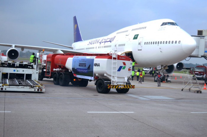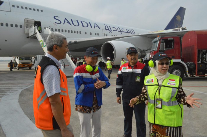 Hari ini, Primarini bersama Executive General Manager (EGM) Angkasa Pura II – Fahroji dan GM Gapura Angkasa – Edwin berkesempatan menyaksikan proses refuelling avtur ke pesawat Saudi Arabia Boeing 747 yang akan menerbangkan 450 jemaah haji. #ren
