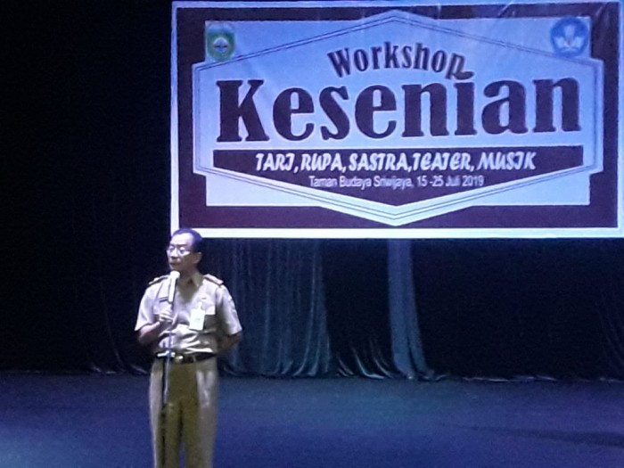 Plt Kepala Dinas Kebudayaan dan Pariwisata (Disbudpar) Provinsi Sumsel Aufa Syahrizal., SP, M.Sc saat membuka Workshop Kesenian Tari, Rupa, Sastra, Teater dan Musik di Gedung Kesenian Graha Budaya, Taman Budaya Sriwijaya, Jakabaring, Palembang dari tanggal 15 hingga 25 Juli 2019 .Acara dibuka, Senin (15/7) oleh Plt Kepala Dinas Kebudayaan dan Pariwisata (Disbudpar) Provinsi Sumsel Aufa Syahrizal., SP, M.Sc