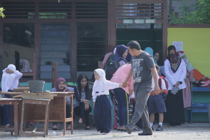 Ada orang tua yang sekadar menunggu di gerbang sekolah.Tapi ada juga yang ikut mendampingi hingga di depan ruangan kelas. Tampak pula beberapa anak menangis karena melihat ibunya di luar ruangan kelas.