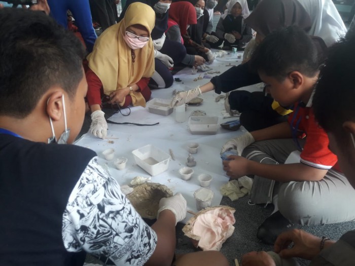 “ Disini ada empat tehnik yang kita ajari, tehnik percetakan profesional menggunakan silokon, tehnik cetak tunggal, tehnik cetak reproduksi, ada bahan yang kita siapkan dari rubber silikon ada tidak pakai cetakan cuma satu di cetak, satu kali jadi, ada cetak alternatif dengan bahan bahan alternatif yang ada di toko bangunan seperti lem kaca, terus ada sagu, baby oil, lemkaca kita gabung sehingga anak-anak melakukannya di rumah harapannya seperti itu, “katanya.