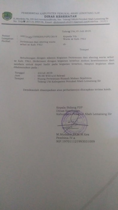 PALI, BP–Terkait adanya surat resmi Dinas Kesehatan (Dinkes) Kabupaten Penukal Abab Lematang Ilir (PALI) yang akan mengundang Wanita-Pria (Waria) se-PALI, yang tertulis didalam surat tersebut akan di laksanakan pada Senin (22/7), pukul 08.00WIB s/d selesai disalahsatu rumah makan dikecamatan Talang ubi, dengan perihal pertemuan dan sharing waria sehat se Kabupaten PALI, dengan nomor surat :440/1437/DINKES/P2PI/2019.