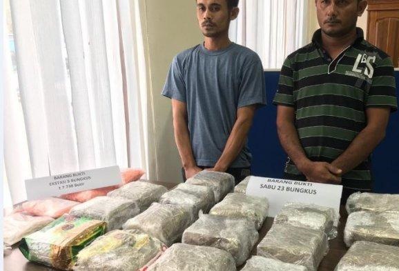 Dari penangkapan keduanya, diamankan barang bukti 23 bungkus narkotika jenis sabu seberat kurang lebih 23 kilogram dan 7.741 butir pil ekstasi.