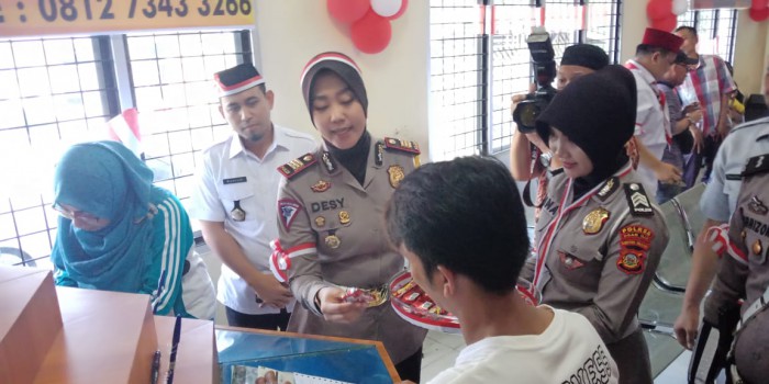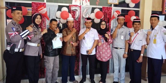 Guna memeriahkan HUT kemerdekaan RI ke 74tahun dan memberikan pelayanan terbaik kepada wajib pajak (wp), Unit Pelaksana Teknis Badan (UPTB) Samsat, Satlantas, Jasaraharja dan Bank Sumsel Babel Kabupaten Ogan Ilir (OI) membagikan coklat secara cuma-cuma, selain itu petugas pajak kendaraan saat melayani wp menggunakan seragam bertema perjuangan berwarna hitam putih yang disertai atribut pita merahputih