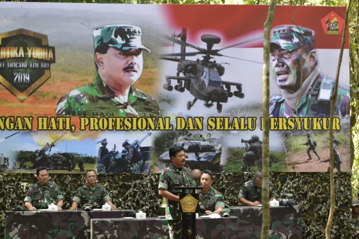 Panglima TNI Marsekal TNI Hadi Tjahjanto dan Kepala Staf Angkatan Darat (Kasad), Jenderal TNI Andika Prakasa menyaksikan langsung puncak Latihan Antar Kecabangan (Latancab) TNI AD “Kartika Yudha 2019” di daerah latihan Pusat Latihan Tempur (Puslatpur), Kodiklatad, Martapura – Baturaja, Sumatera Selatan (Sumsel), Senin (19/8).