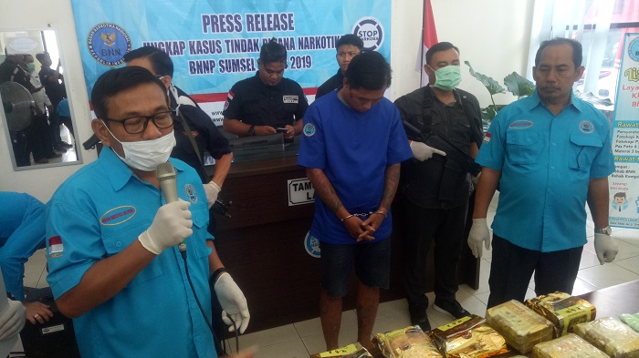 “Awalnya kita mendapat informasi dari masyarakat tentang adanya transaksi narkoba tiga pekan lalu. Setelah ditelusuri tim kita, kemarin Senin (26/8) pukul 08.00 datang satu unit mobil Agya yang dikendarai tersangka. Setelah dibuntuti tersangka ini berkeliling masuk salah satu hotel,” kata Kepala BNNP Sumatera Selatan, Brigjen Pol Jhon Turman didampingi Kabid Pemberantasan, AKBP Agung, saat press release.