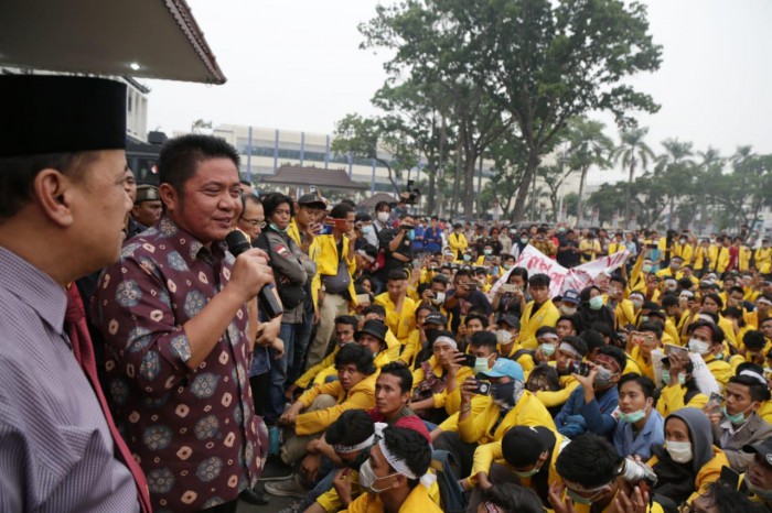 Usai meninjau sejumlah titik Kebakaran Hutan dan Lahan (Karhutla) di Kabupaten Ogan Ilir, Gubernur Sumatera Selatan (Sumsel) H. Herman Deru bersama dengan Forum Koordinasi Pimpinan Daerah (Forkopimda) dan pasca ricuh antara massa dari gabungan mahasiswa dari Universitas negeri dan swasta seluruh Sumsel yang tergabung dalam Gerakan Sumsel Melawan Asap dengan aparat terkait ketidak seriusan Pemerintah Provinsi (Pemprov) Sumatera Selatan (Sumsel) dalam menangani Kebakaran Hutan dan Lahan (Karhutla) terjadi di Kantor Gubernur Sumsel, Selasa (17/9) berujung ricuh. Gubernur Sumsel dan rombongan akhrinya menemui para mahasiawa.