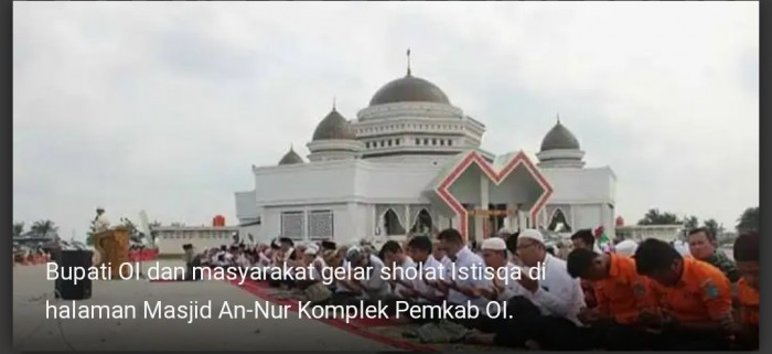 Gara-gara kemarau yang berkepanjangan, dan terjadinya kebakaran lahan dimana mana, Bupati OI H.M Ilyas Panji Alam bersama aparatur sipil negara (ASN) dan warga melaksanakan sholat Istisqa di halaman Masjid Agung An-Nur Komplek Perkantoran Terpadu Pemkab Ogan Ilir Tanjung Senai, Rabu (25/9) pagi. Bahkan Direkrur PDAM Tirta Ogan M Azwar turut mendukung dan sholat bersama