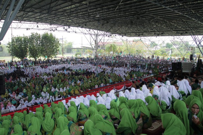 Sekayu, BP–Lantunan ayat Suci Alquran menggema di Stable Berkuda Sekayu, lantang suara ribuan santriwan dan santriwati serta warga Nahdlatul Ulama (NU) menyanyikan Lagu Ya Lal Wathan. Suasana ini merupakan rangkaian dari kegiatan peringatan HUT Muba ke-63 sekaligus Hari Santri Nasional Muba yang dipusatkan di Kota Sekayu, Rabu (2/10/2019).