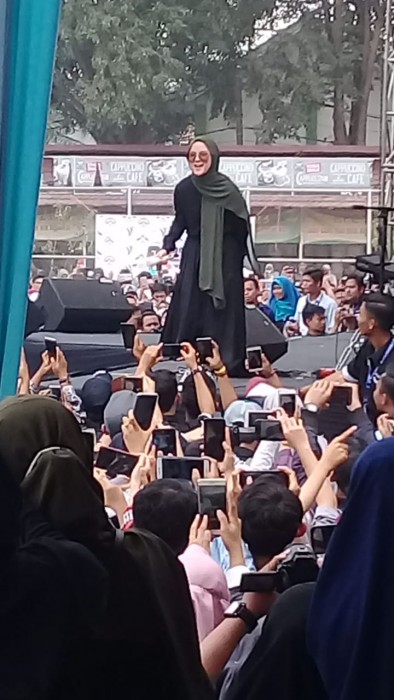 Palembang, BP–Penampilan Nissa Sabyan di kampus Universitas Islam Negeri (UIN) Raden Fatah Palembang, Rabu (9/10), membuat ribuan mahasiswa berteriak histeris.