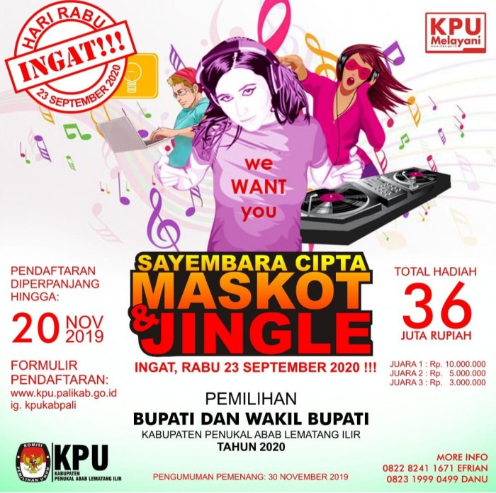PALI, BP–Komisi Pemilihan Umum (KPU) Daerah Kabupaten Penukal Abab Lematang Ilir (PALI) menambah waktu pendaftaran bagi peserta yang hendak mengikuti sayembara cipta maskot dan jingle tentang Pemilihan Kepala Daerah (Pilkada) PALI 2020.Kepala KPU Kabupaten PALI, Sunario berkata bahwa sebelumnya KPUD PALI mengumumkan bahwa pembukaan pendaftaran sayembara cipta maskot dan jingle mulai tanggal 1 November sampai 14 November 2019.