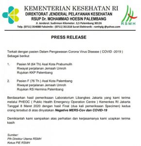 Rumah Sakit Umum Pusat (RSUP) Mohammad Husein Palembang mengumumkan dua pasien isolasi yang di duga Suspect virus Corona beberapa hari yang lalu di nyatakan Negative Mers-Cov dan Covid-19.
