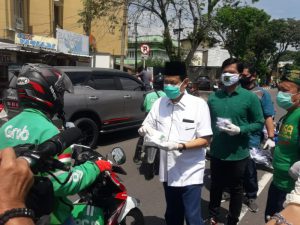 Dewan Pimpinan Cabang (DPC) Partai Persatuan Pembangunan (PPP) Kota Palembang membagi-bagikan masker gratis untuk para pengguna jalan baik pengendara sepeda motor maupun roda empat, Rabu (8/4) di depan kantor Gedung DPC PPP Kota Palembang di Jalan Merdeka Palembang.
