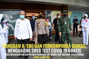 Pangdam II/Swj Mayjen TNI Irwan, S.I.P., M. Hum., bersama Forkopimda Sumsel meninjau kegiatan Swab Test gratis yang digelar PT. Bank Negara Indonesia (Persero) Tbk (BNI) bertempat di Komplek Jakabari Sport Center (JSC) Palembang, Senin (8/6).