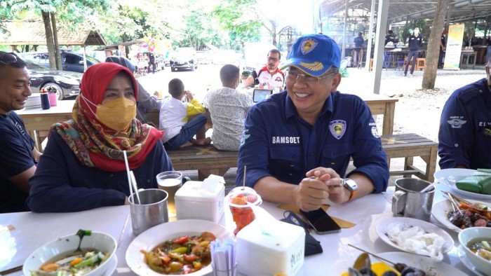Purwakarta, BP–Ketua MPR RI Bambang Soesatyo (Bamsoet) menikmati kuliner khas Purwakarta, Sate Maranggi Hj Yetty, di jalan raya Bungursari, Minggu (22/3).