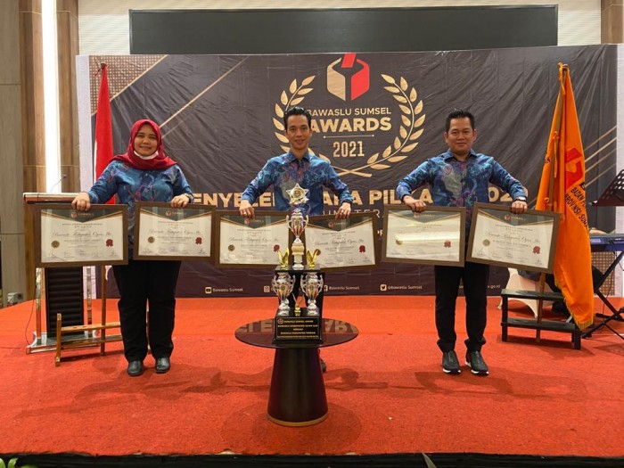 Palembang, BP–Pecah rekor, di bawah kepemimpinan Dermawan Iskandar selaku ketua dan Idris serta Karlina selaku anggota, Bawaslu Kabupaten Ogan Ilir (OI) berhasil menyabet prestasi bintang berupa juara umum Bawaslu Sumsel Awards 2021, Jumat (2/4) di Hotel Excelton Palembang. Penghargaan tersebut diserahkan secara langsung oleh Ketua Bawaslu Sumsel Iin Irwanto dadampingi anggota bawaslu sumsel, Junaidi, yenli elmanoferi, syamsul alwi dan iwan ardiansyah serta kasek bawaslu sumsel rahmad, juga disaksikan Ketua KPU Sumsel Amrah Muslimin.