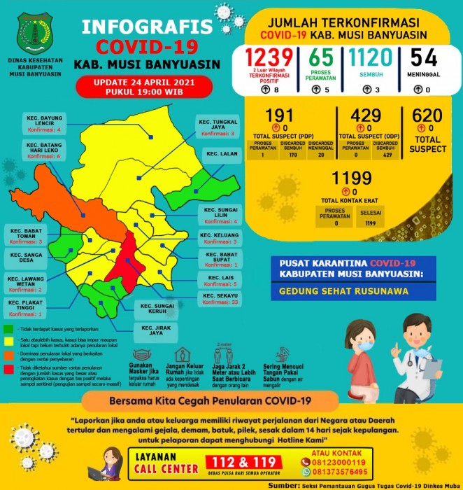 “Ada penambahan 3 kasus sembuh dan 8 terkonfirmasi positif per 24 April 2021,” ungkap Jubir Gugus Tugas Penanganan COVID-19 Muba, Seftiani Peratita SS MKes.