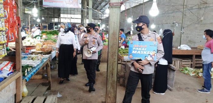 Selain imbauan, Polres Muba dan Disdagperin Muba juga membagikan masker kepada para pedagang dan pengunjung pasar.