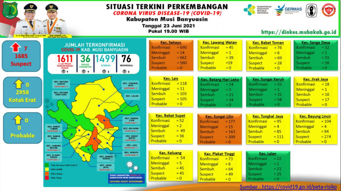 Sekayu, BP– Gugus Tugas Penanganan COVID-19 Muba, Rabu (23/6/2021) mengkonfirmasi penambahan 3 kasus sembuh dan 9 positif.