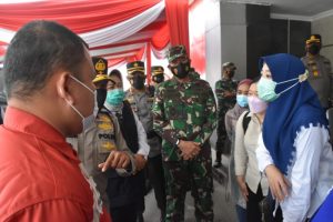 Palembang, BP- Komandan Korem 044/Gapo Brigjen TNI Jauhari Agus Suraji S.I.P., S.Sos bersama Waka Polda Sumatera Selatan (Sumsel) Brigjen Pol Rudi Setiawan meninjau lokasi 1 juta vaksin perhari, bertempat di Ruang Lobby Gedung Promoter Mapolda Sumsel , dalam rangka giat vaksinasi Massal dalam rangka hari Bhayangkara ke-75 Tahun 2021, Rabu (23/6).