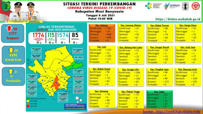 Povi merinci, adapun penambahan kasus positif diantaranya kasus 1749 Laki-laki 61 tahun asal Sekayu, kasus 1750 perempuan 32 tahun Sekayu, kasus 1751 Laki-laki 62 tahun Babat Supat, kasus 1752 perempuan 51 tahun Plakat Tinggi, kasus 1753 perempuan 29 tahun Muara Teladan, kasus 1754 Laki-laki 38 tahun Lumpatan, kasus 1755 perempuan 52 tahun Sungai Lilin, kasus 1756 perempuan 52 tahun Sungai Lilin, kasus 1757 Laki-laki 38 tahun Tungkal Jaya.