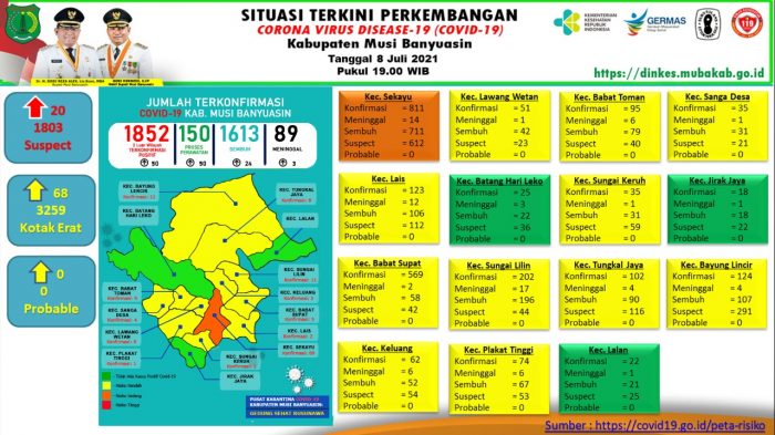 “Ada penambahan 24 kasus sembuh, 50 positif, dan 3 meninggal dunia per 8 Juli 2021,” ungkap Jubir Gugus Tugas Penanganan COVID-19 Muba, dr Povi Pada Indarta SP P.