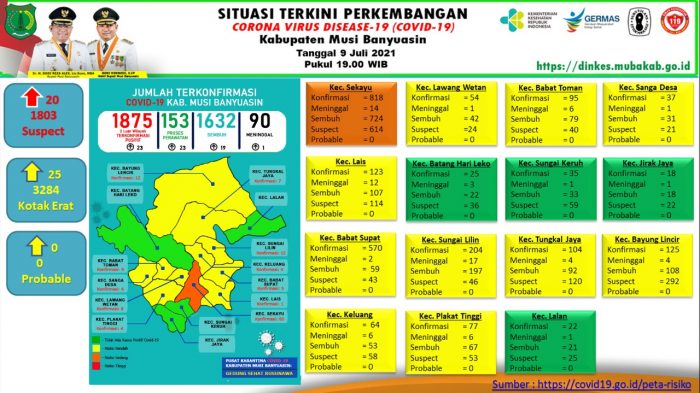 Povi merinci, adapun penambahan kasus positif yakni kasus 1853 Laki-laki usia 48 tahun asal Keluang, kasus 1854 perempuan 59 tahun Babat Supat, kasus 1855 perempuan 10 tahun Lawang Wetan, kasus 1856 Laki-laki 58 tahun Sungai Lilin, kasus 1857 perempuan 46 tahun Bayung Lencir, kasus 1858 perempuan 51 tahun Tungkal Jaya, kasus 1859 perempuan 50 tahun Sungai Lilin, kasus 1860 Laki-laki 60 tahun Keluang, kasus 1861 perempuan 75 tahun Tungkal Jaya, kasus 1862 perempuan 3 tahun Sekayu.