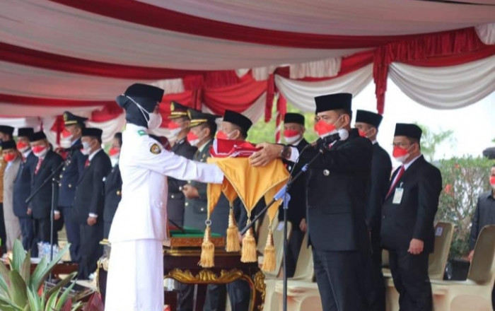 Pembawa bendera pusaka Via Nanda siswi SMAN I OKU.